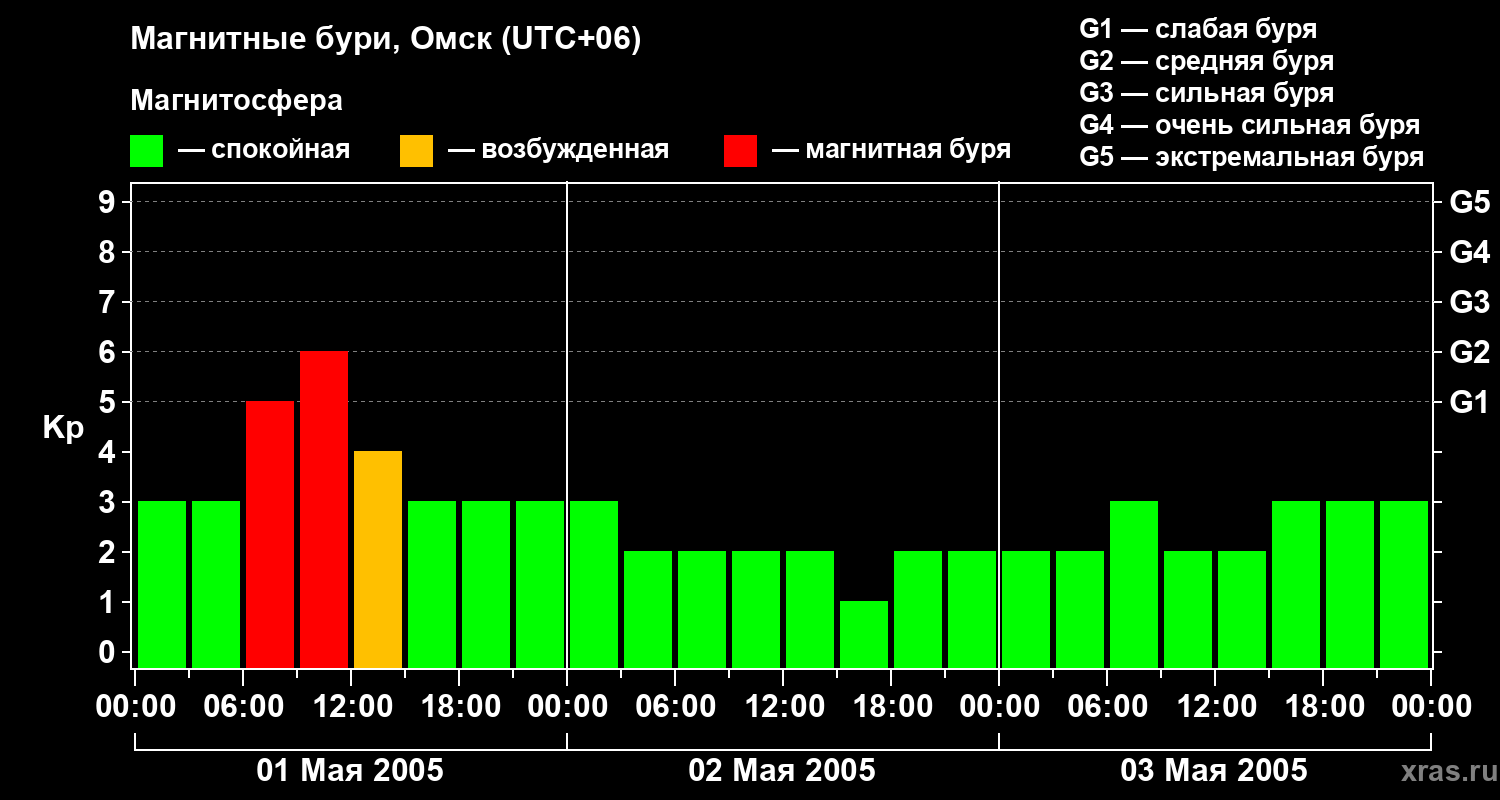 Изменения геомагнитного индекса Kp с 1 по 3 мая 2005 года для средних широт