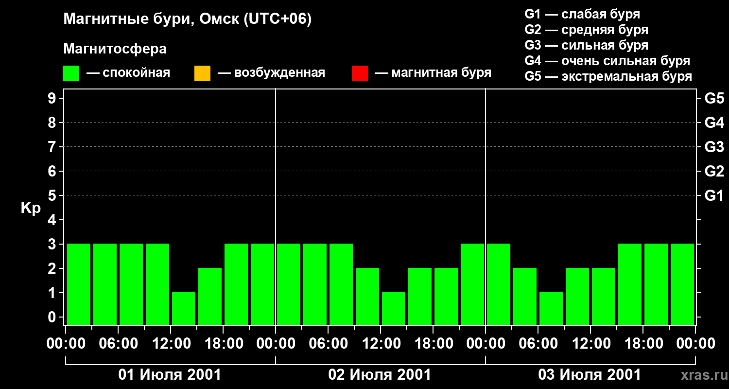 Изменения геомагнитного индекса Kp с 1 по 3 июля 2001 года для средних широт