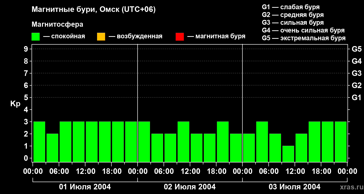 Изменения геомагнитного индекса Kp с 1 по 3 июля 2004 года для средних широт