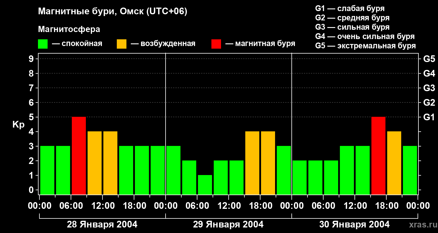 Изменения геомагнитного индекса Kp с 28 по 30 января 2004 года для средних широт