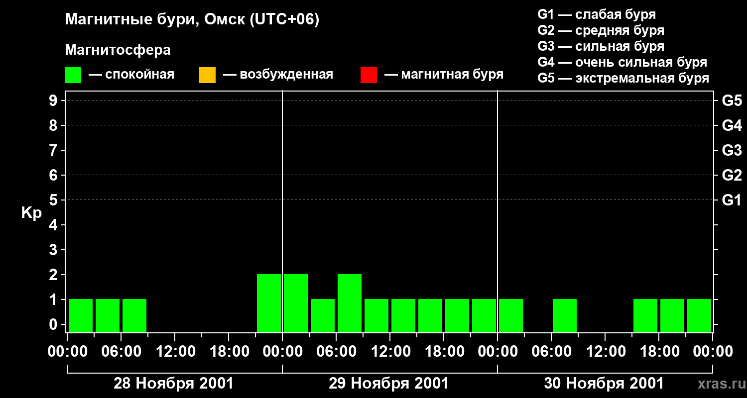 Изменения геомагнитного индекса Kp с 28 по 30 ноября 2001 года для средних широт