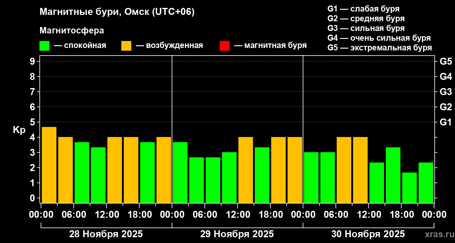 Изменения геомагнитного индекса Kp с 28 по 30 ноября 2025 года для средних широт