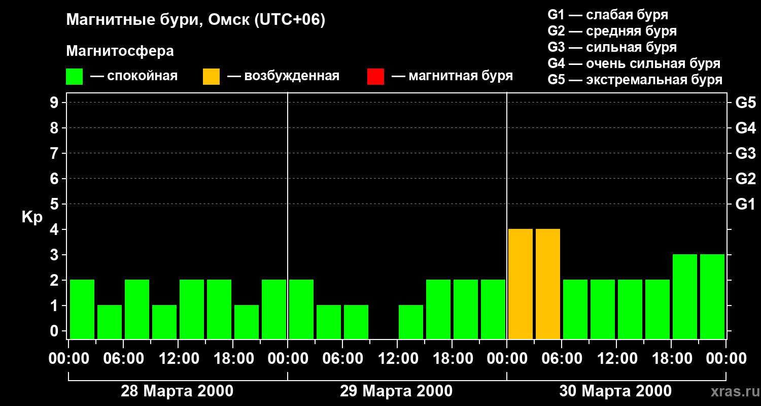 Изменения геомагнитного индекса Kp с 28 по 30 марта 2000 года для средних широт