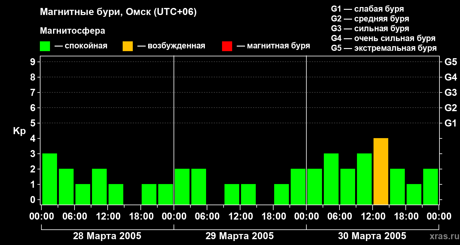 Изменения геомагнитного индекса Kp с 28 по 30 марта 2005 года для средних широт