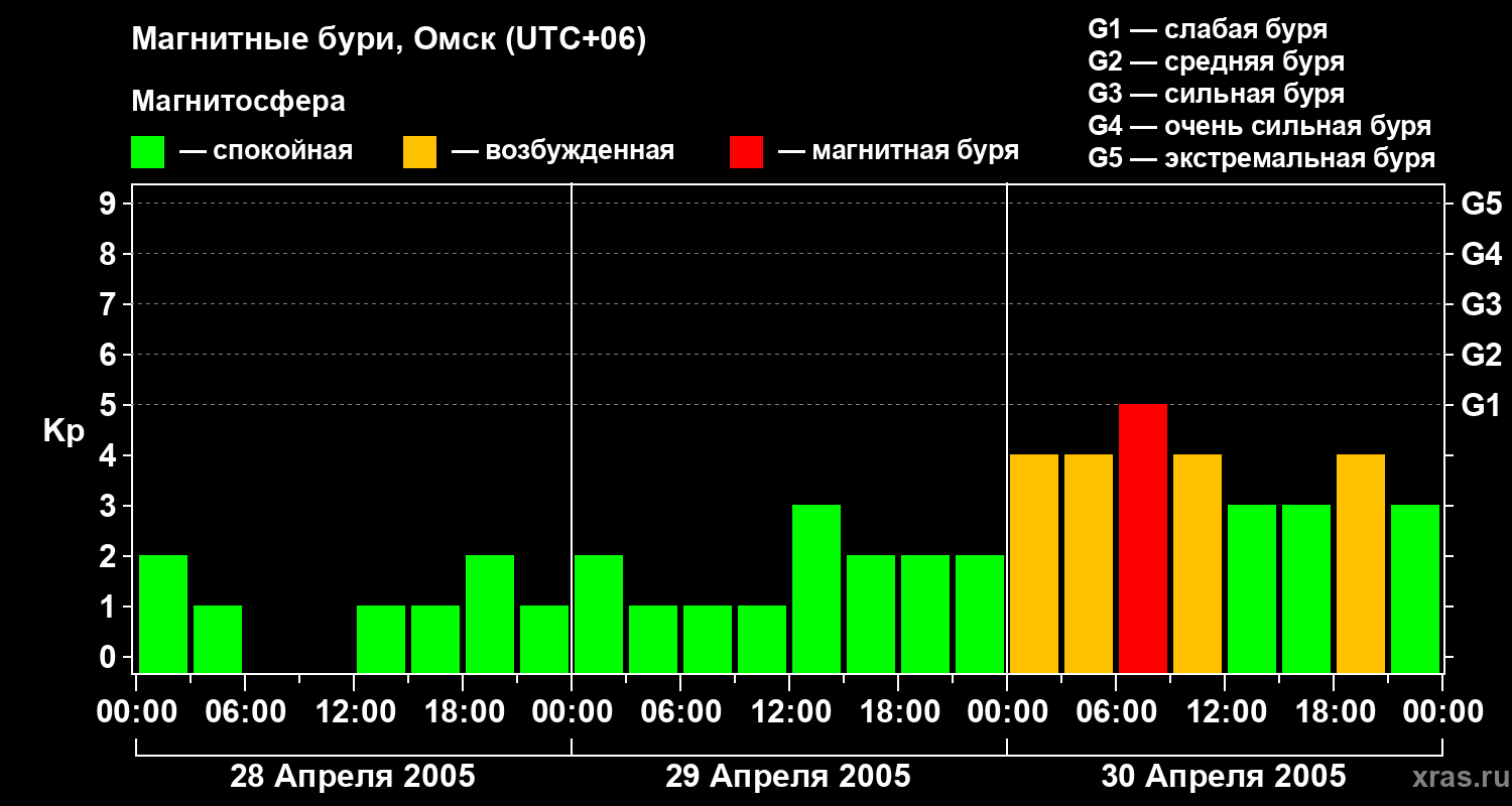 Изменения геомагнитного индекса Kp с 28 по 30 апреля 2005 года для средних широт