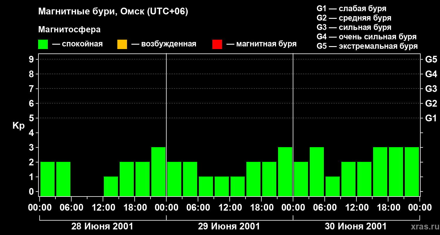 Изменения геомагнитного индекса Kp с 28 по 30 июня 2001 года для средних широт