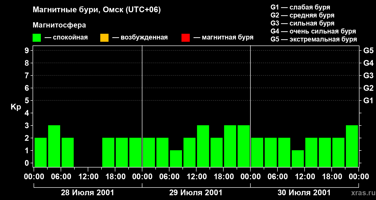 Изменения геомагнитного индекса Kp с 28 по 30 июля 2001 года для средних широт