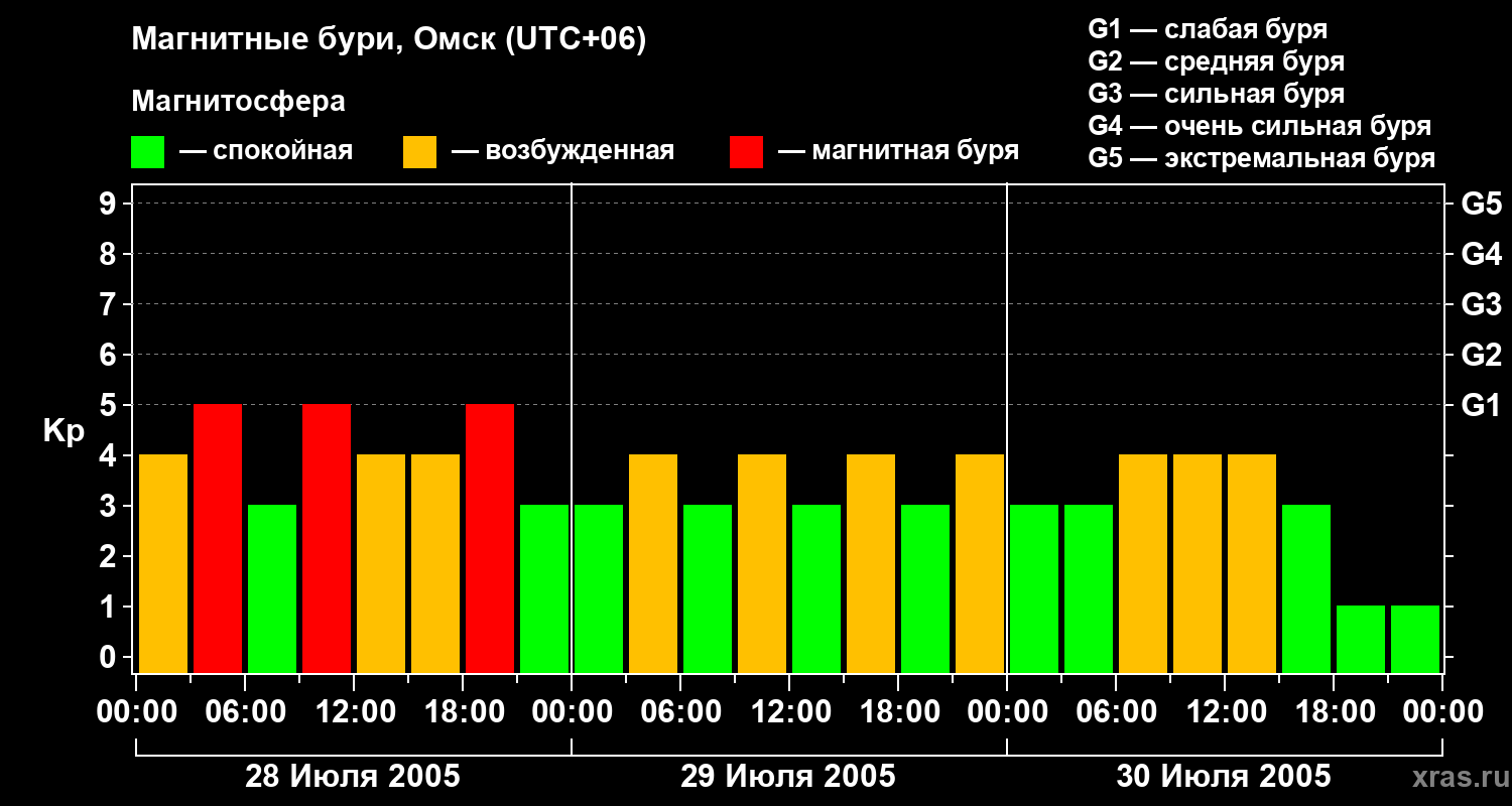 Изменения геомагнитного индекса Kp с 28 по 30 июля 2005 года для средних широт