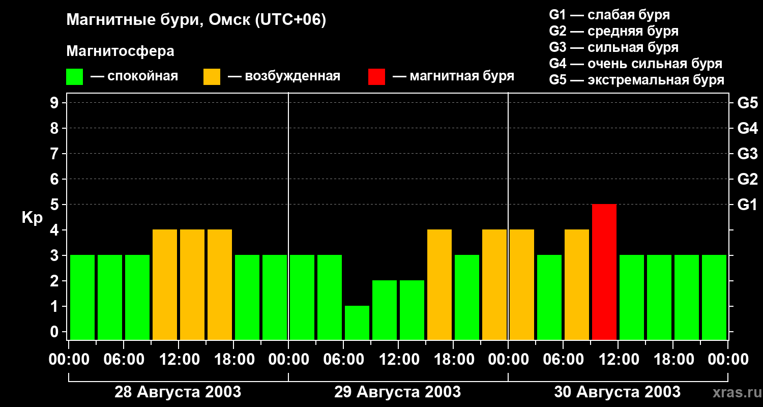 Изменения геомагнитного индекса Kp с 28 по 30 августа 2003 года для средних широт