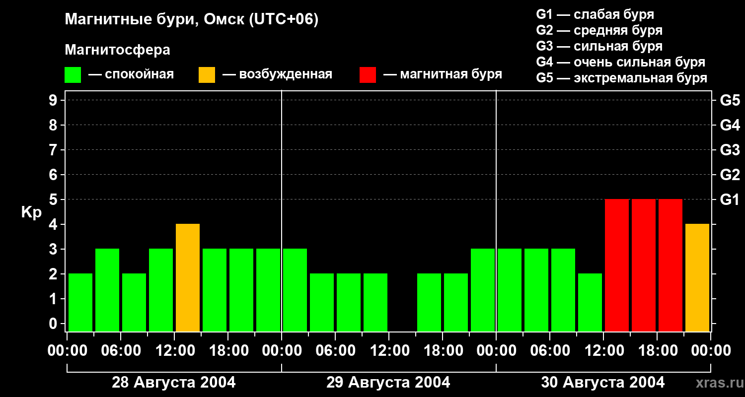 Изменения геомагнитного индекса Kp с 28 по 30 августа 2004 года для средних широт