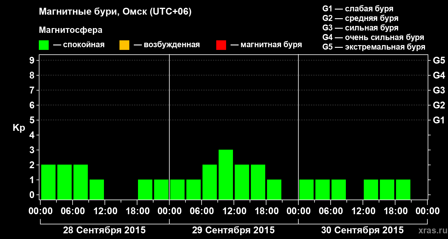 Изменения геомагнитного индекса Kp с 28 по 30 сентября 2015 года для средних широт