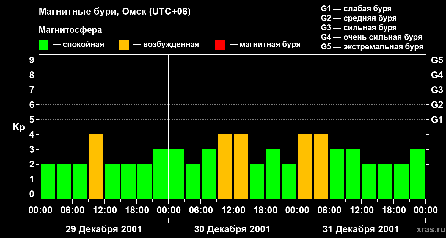 Изменения геомагнитного индекса Kp с 29 по 31 декабря 2001 года для средних широт