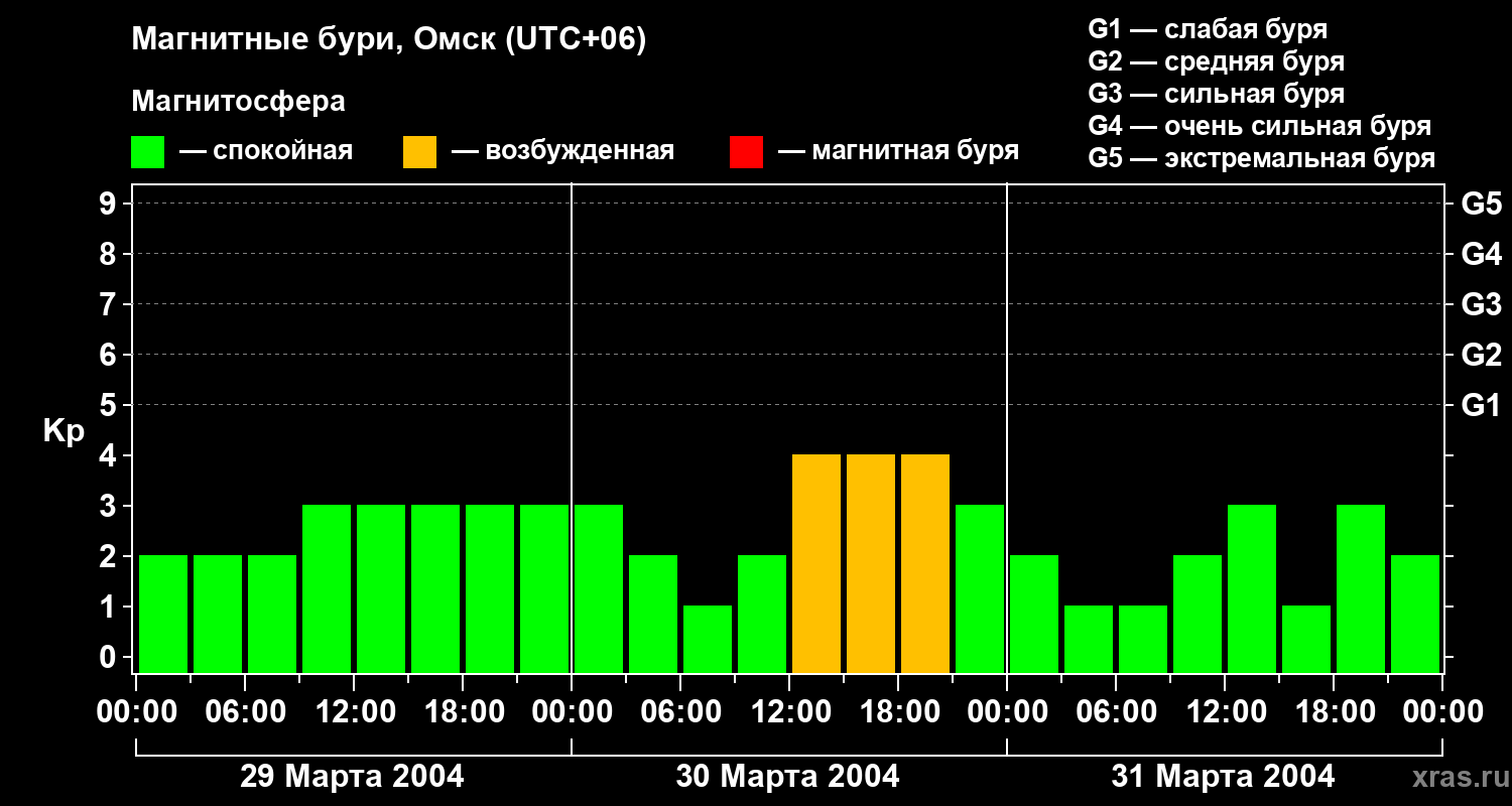 Изменения геомагнитного индекса Kp с 29 по 31 марта 2004 года для средних широт