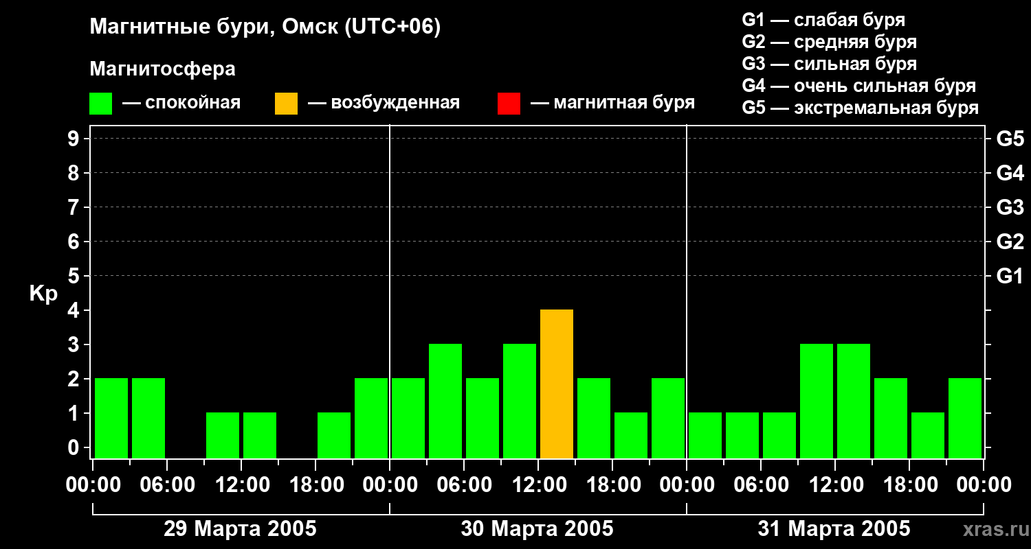 Изменения геомагнитного индекса Kp с 29 по 31 марта 2005 года для средних широт