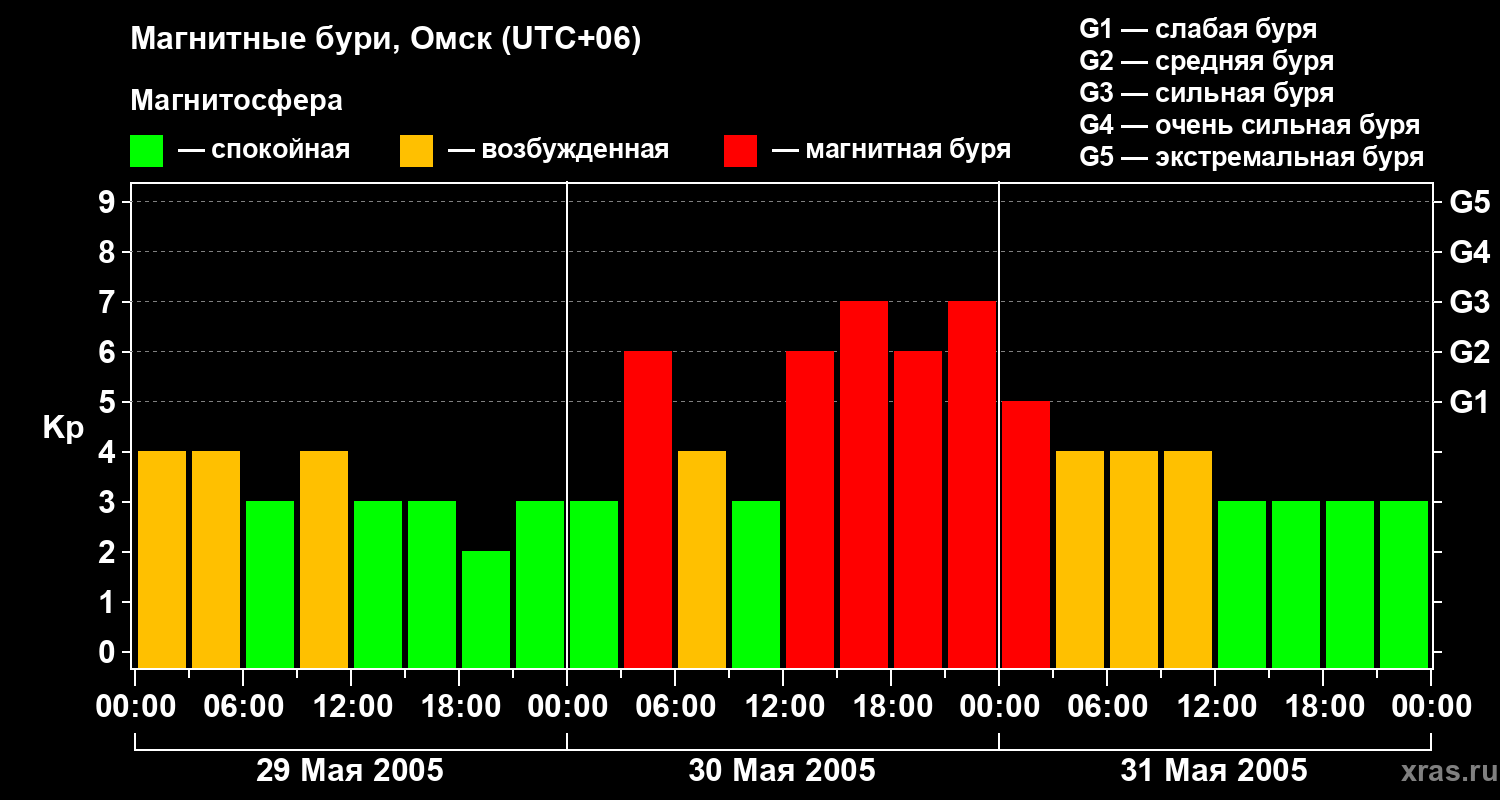Изменения геомагнитного индекса Kp с 29 по 31 мая 2005 года для средних широт