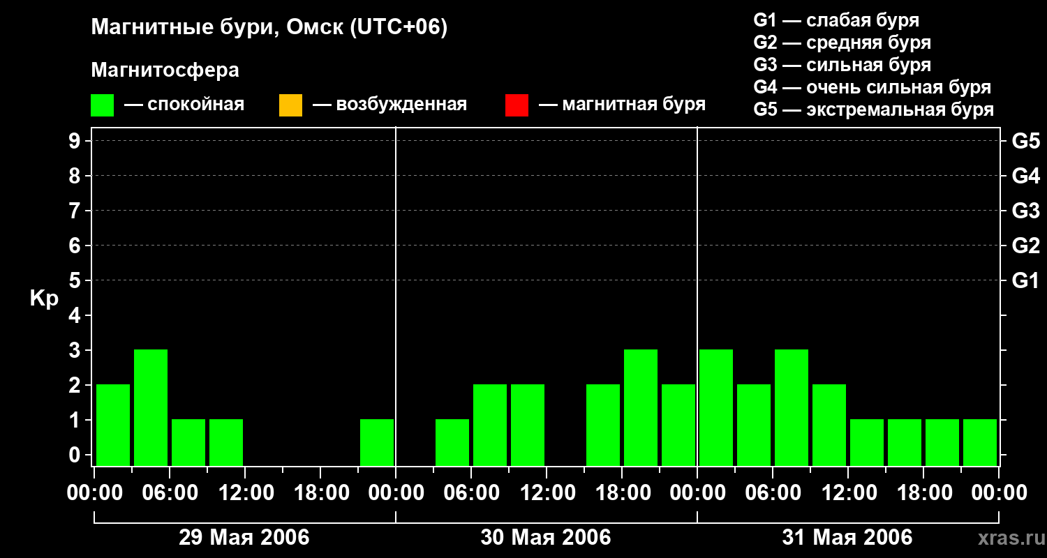 Изменения геомагнитного индекса Kp с 29 по 31 мая 2006 года для средних широт