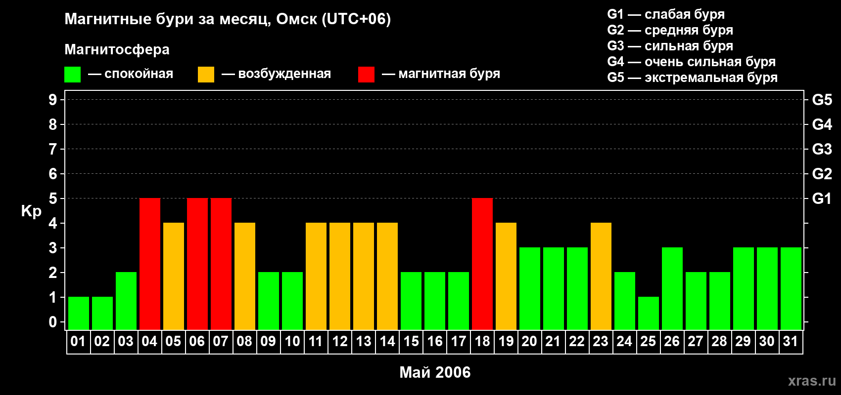 Изменения максимального суточного геомагнитного индекса Kp в мае 2006 года для средних широт