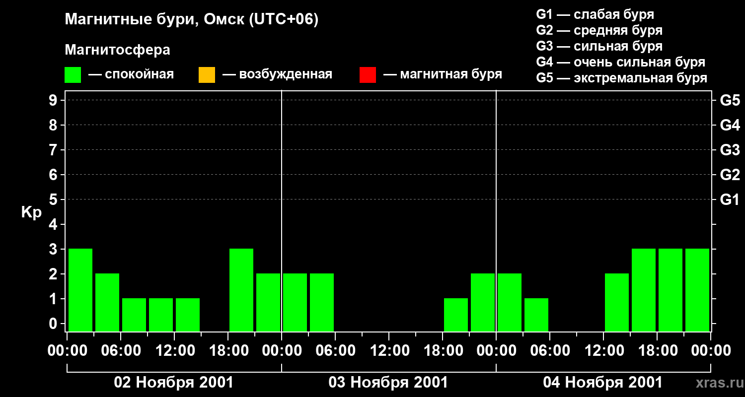 Изменения геомагнитного индекса Kp с 2 по 4 ноября 2001 года для средних широт