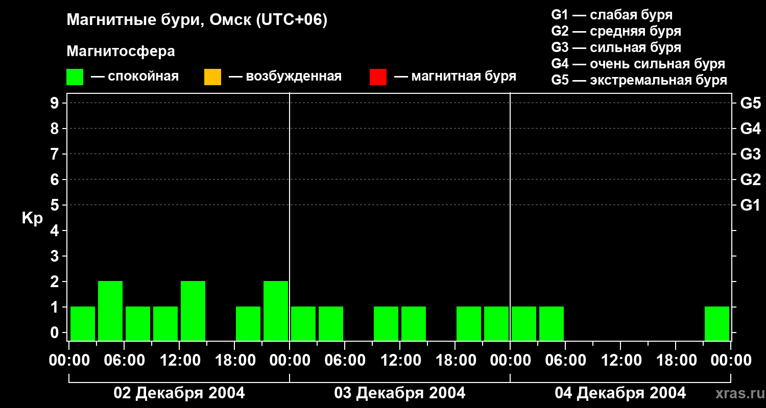 Изменения геомагнитного индекса Kp с 2 по 4 декабря 2004 года для средних широт