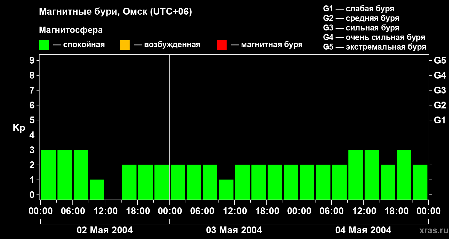 Изменения геомагнитного индекса Kp с 2 по 4 мая 2004 года для средних широт