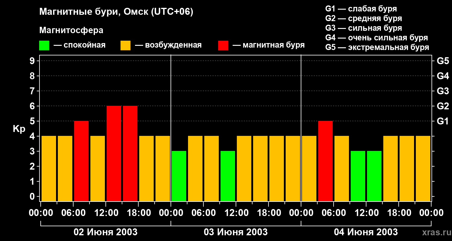Изменения геомагнитного индекса Kp с 2 по 4 июня 2003 года для средних широт