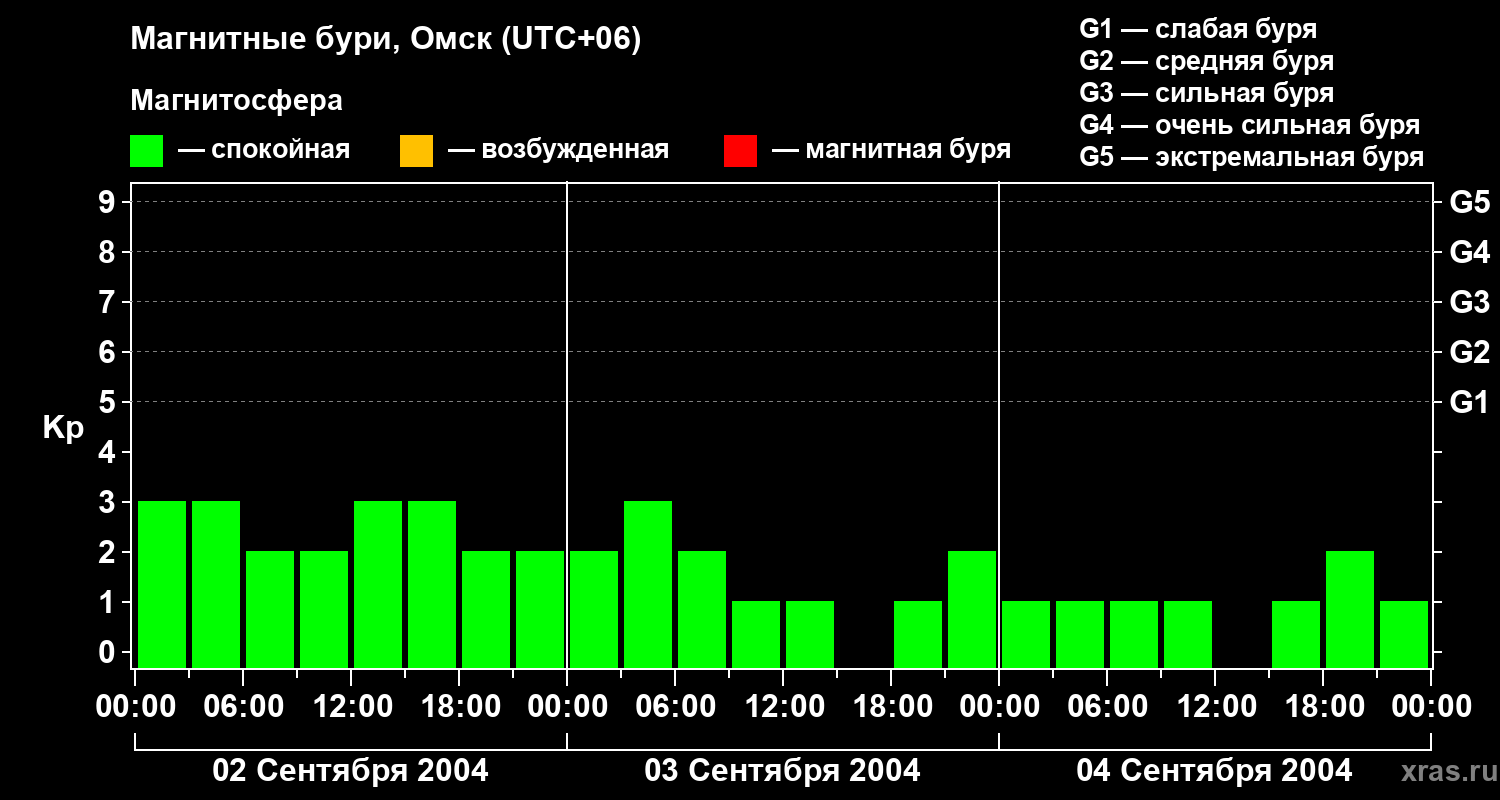 Изменения геомагнитного индекса Kp с 2 по 4 сентября 2004 года для средних широт