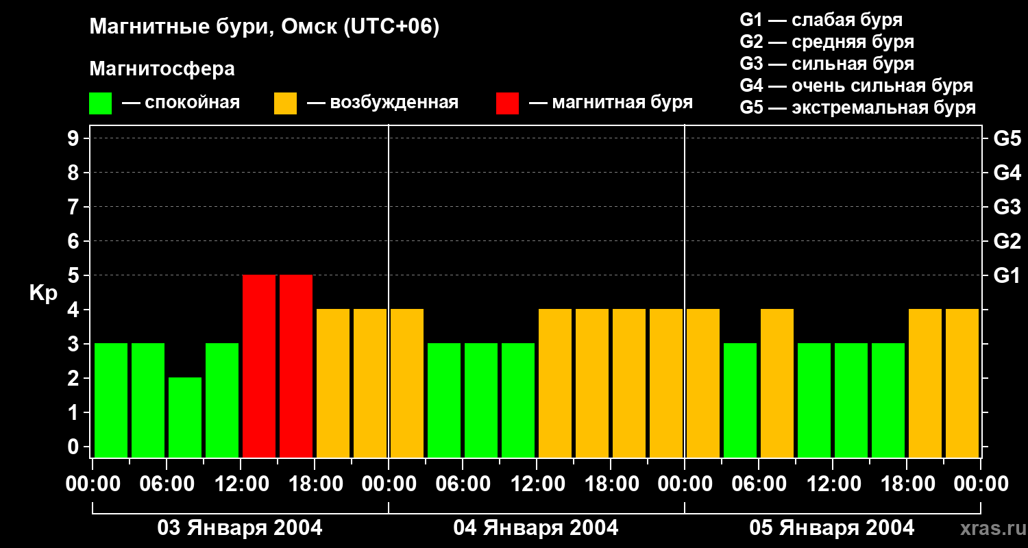 Изменения геомагнитного индекса Kp с 3 по 5 января 2004 года для средних широт