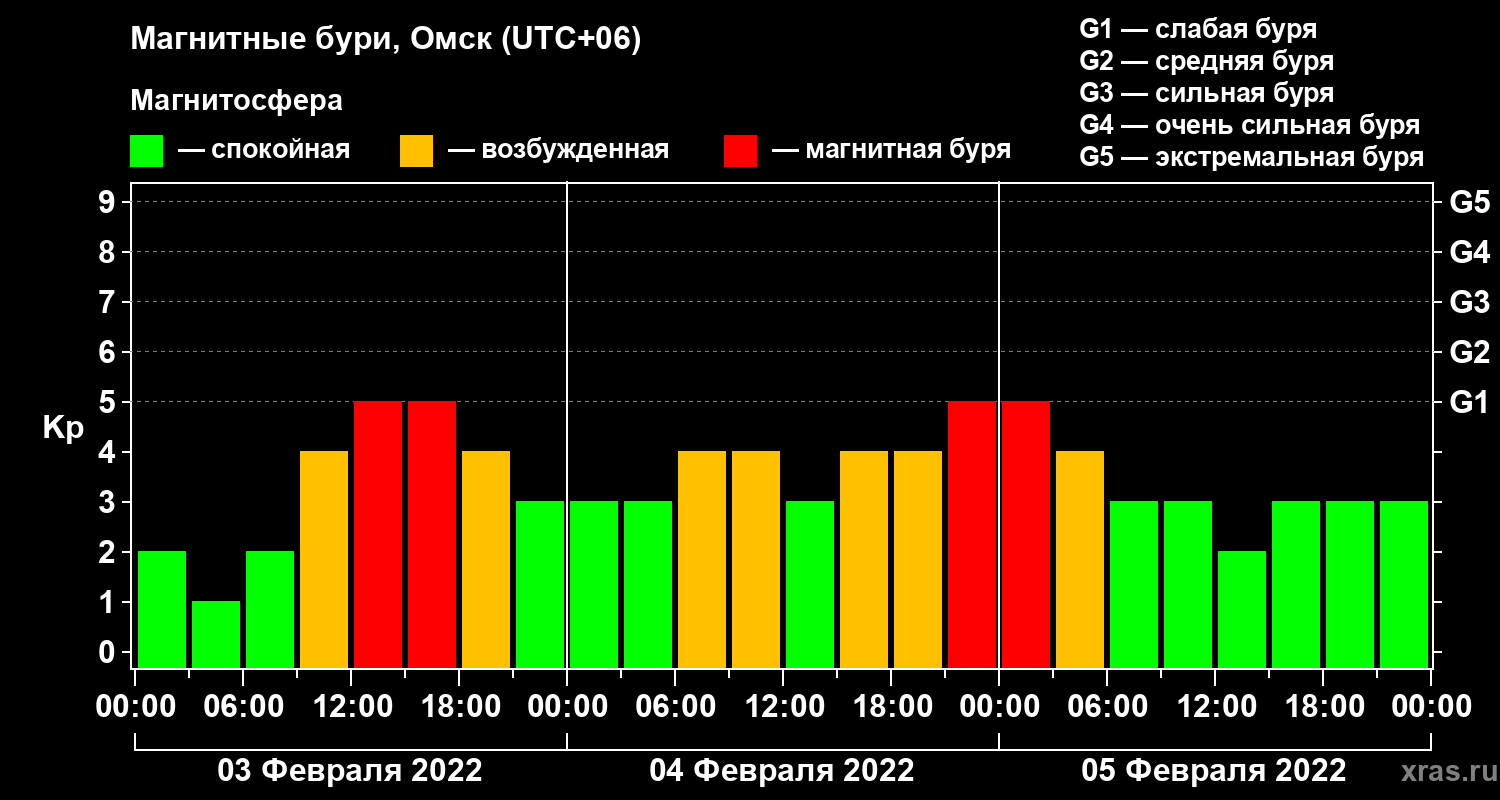 Изменения геомагнитного индекса Kp с 3 по 5 февраля 2022 года для средних широт