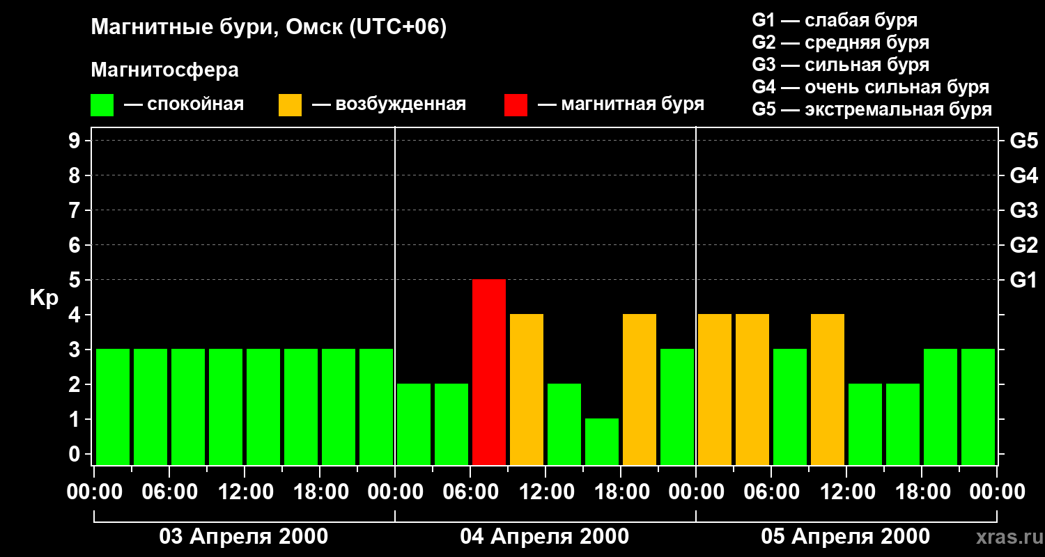 Изменения геомагнитного индекса Kp с 3 по 5 апреля 2000 года для средних широт