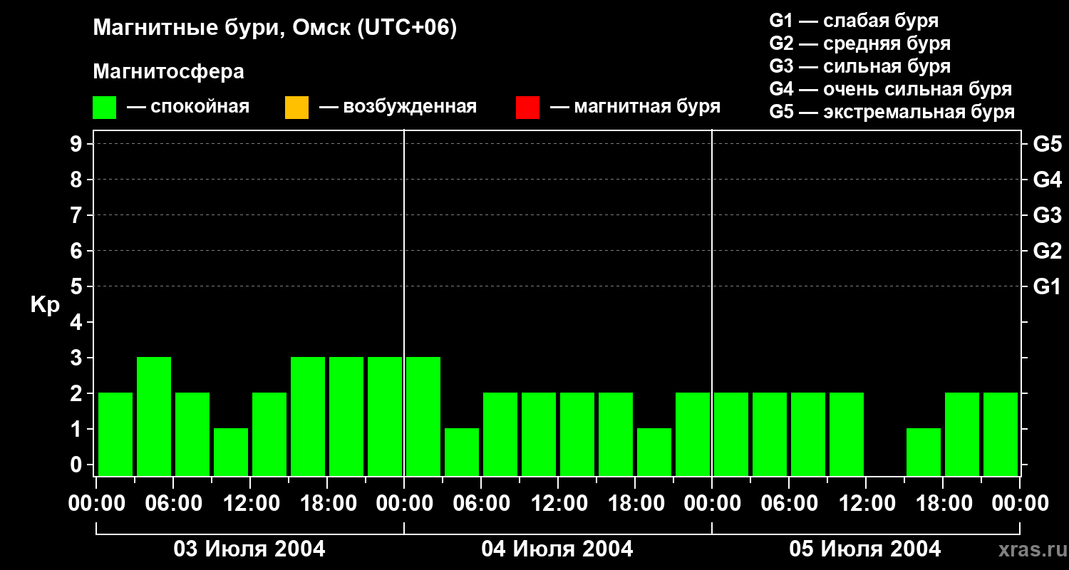 Изменения геомагнитного индекса Kp с 3 по 5 июля 2004 года для средних широт