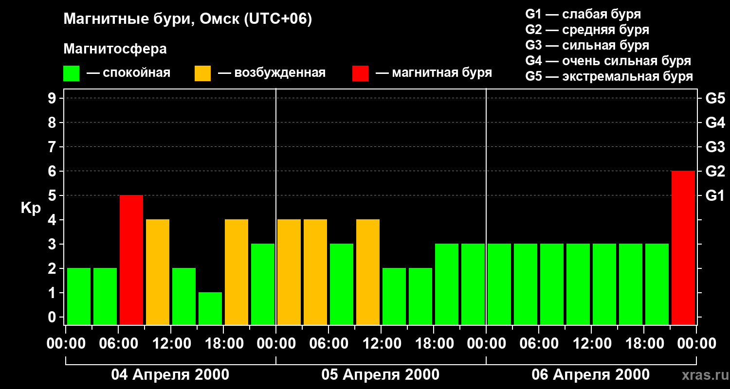 Изменения геомагнитного индекса Kp с 4 по 6 апреля 2000 года для средних широт
