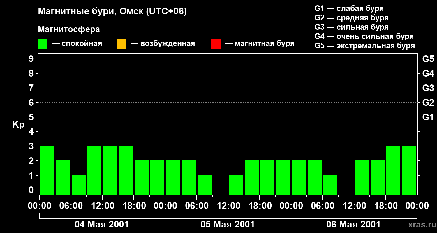 Изменения геомагнитного индекса Kp с 4 по 6 мая 2001 года для средних широт