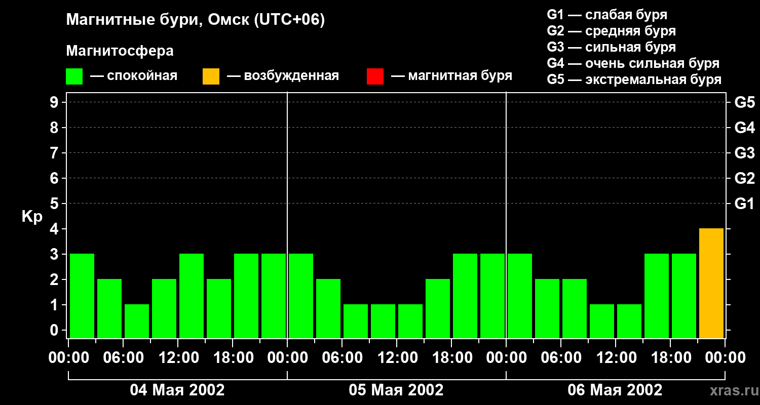 Изменения геомагнитного индекса Kp с 4 по 6 мая 2002 года для средних широт