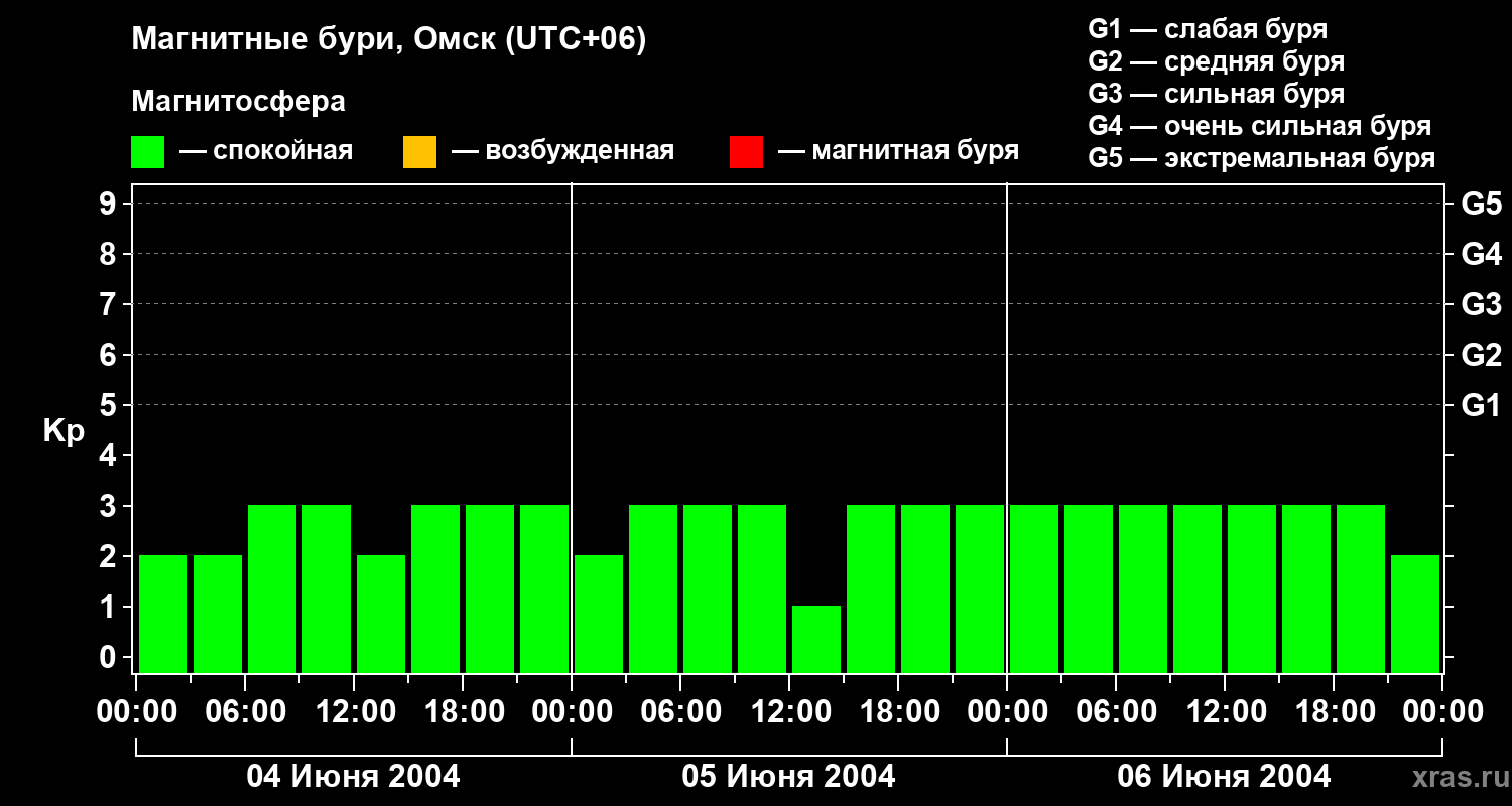 Изменения геомагнитного индекса Kp с 4 по 6 июня 2004 года для средних широт