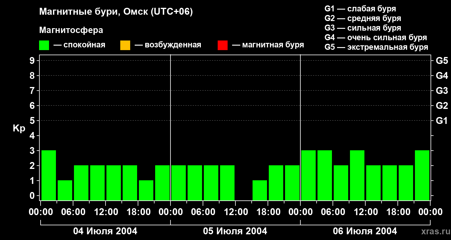 Изменения геомагнитного индекса Kp с 4 по 6 июля 2004 года для средних широт
