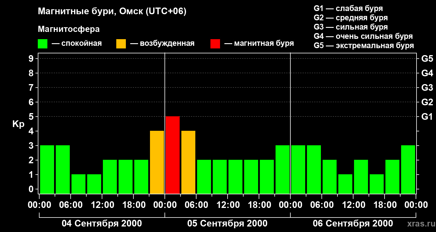 Изменения геомагнитного индекса Kp с 4 по 6 сентября 2000 года для средних широт