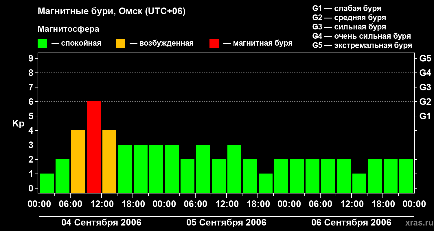 Изменения геомагнитного индекса Kp с 4 по 6 сентября 2006 года для средних широт