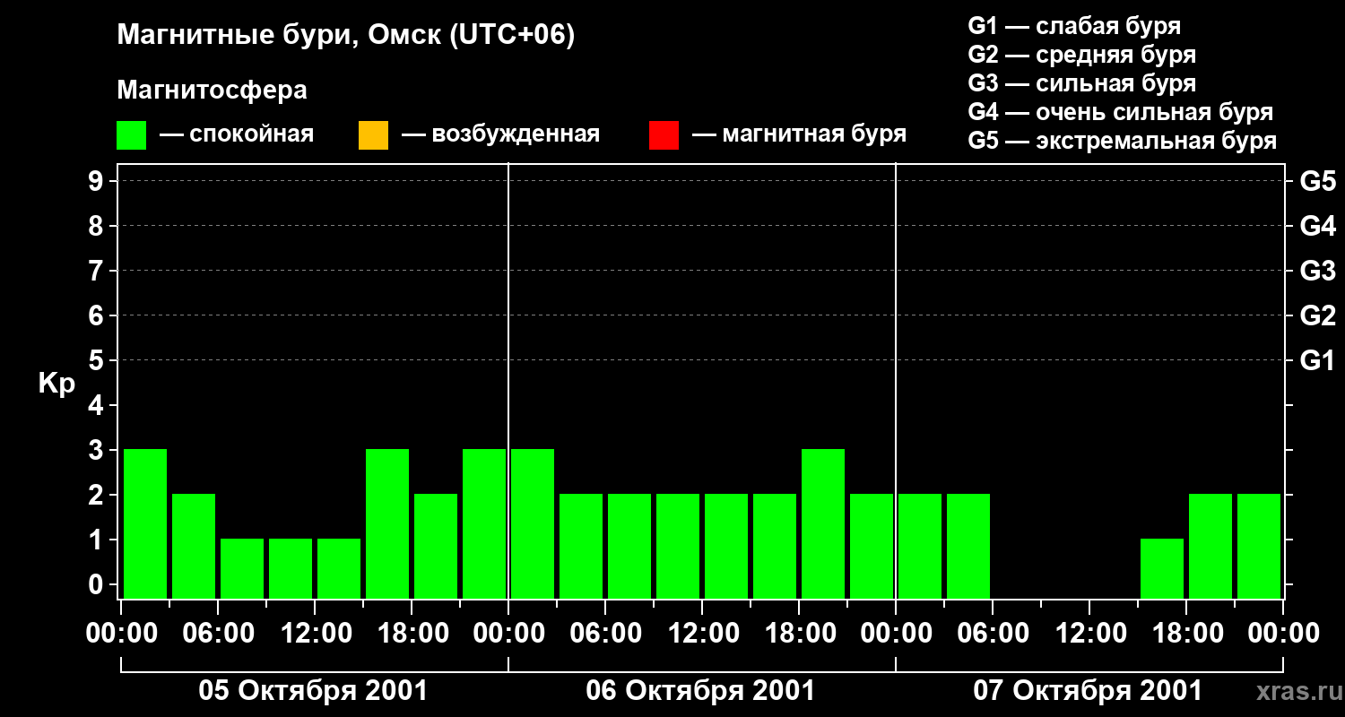 Изменения геомагнитного индекса Kp с 5 по 7 октября 2001 года для средних широт