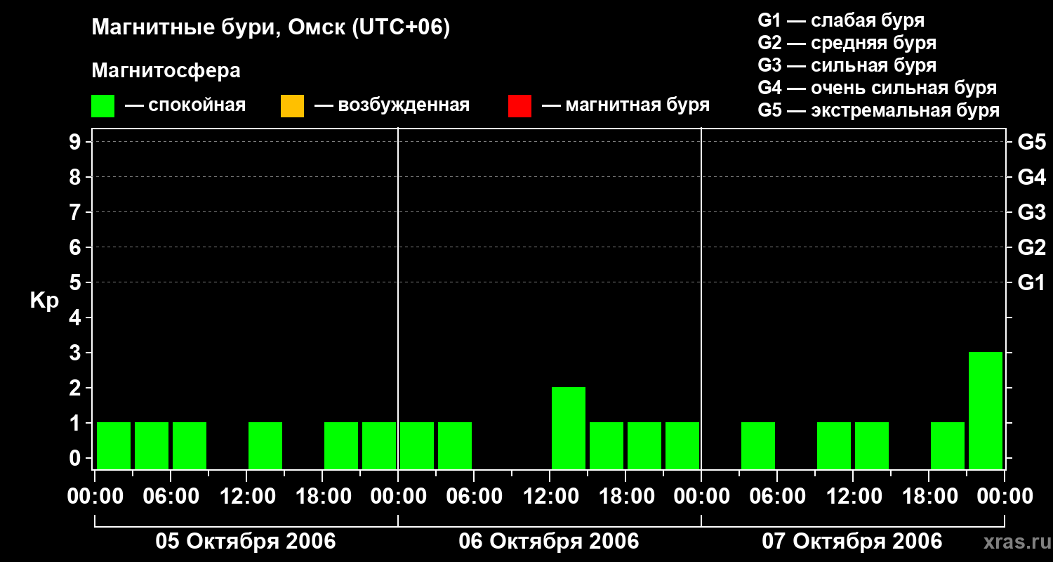 Изменения геомагнитного индекса Kp с 5 по 7 октября 2006 года для средних широт