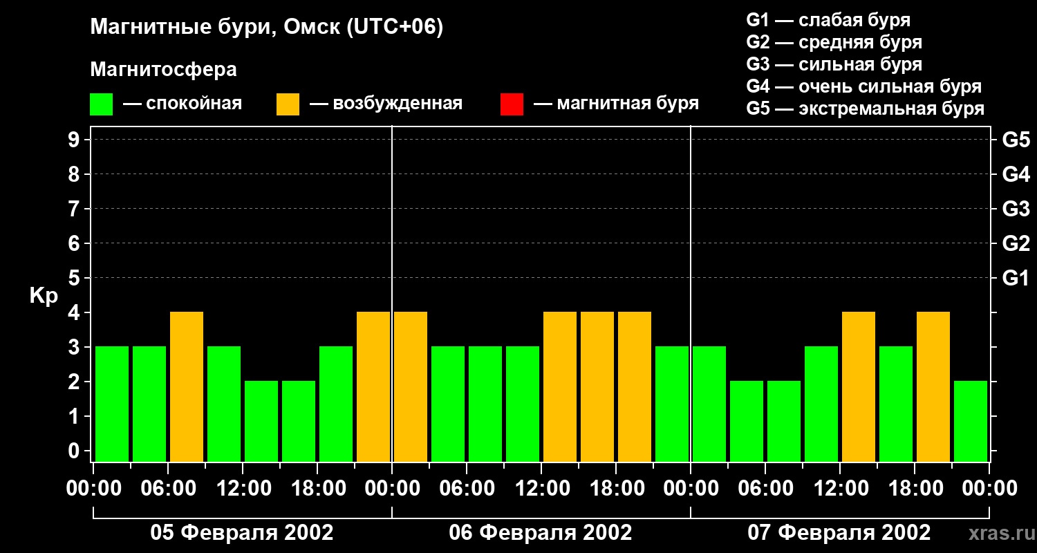 Изменения геомагнитного индекса Kp с 5 по 7 февраля 2002 года для средних широт