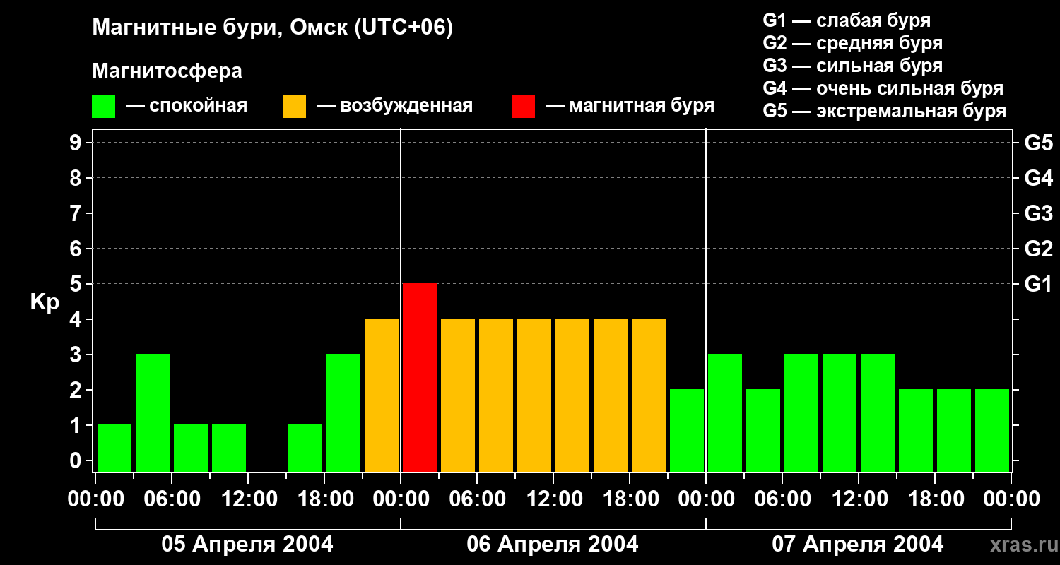 Изменения геомагнитного индекса Kp с 5 по 7 апреля 2004 года для средних широт
