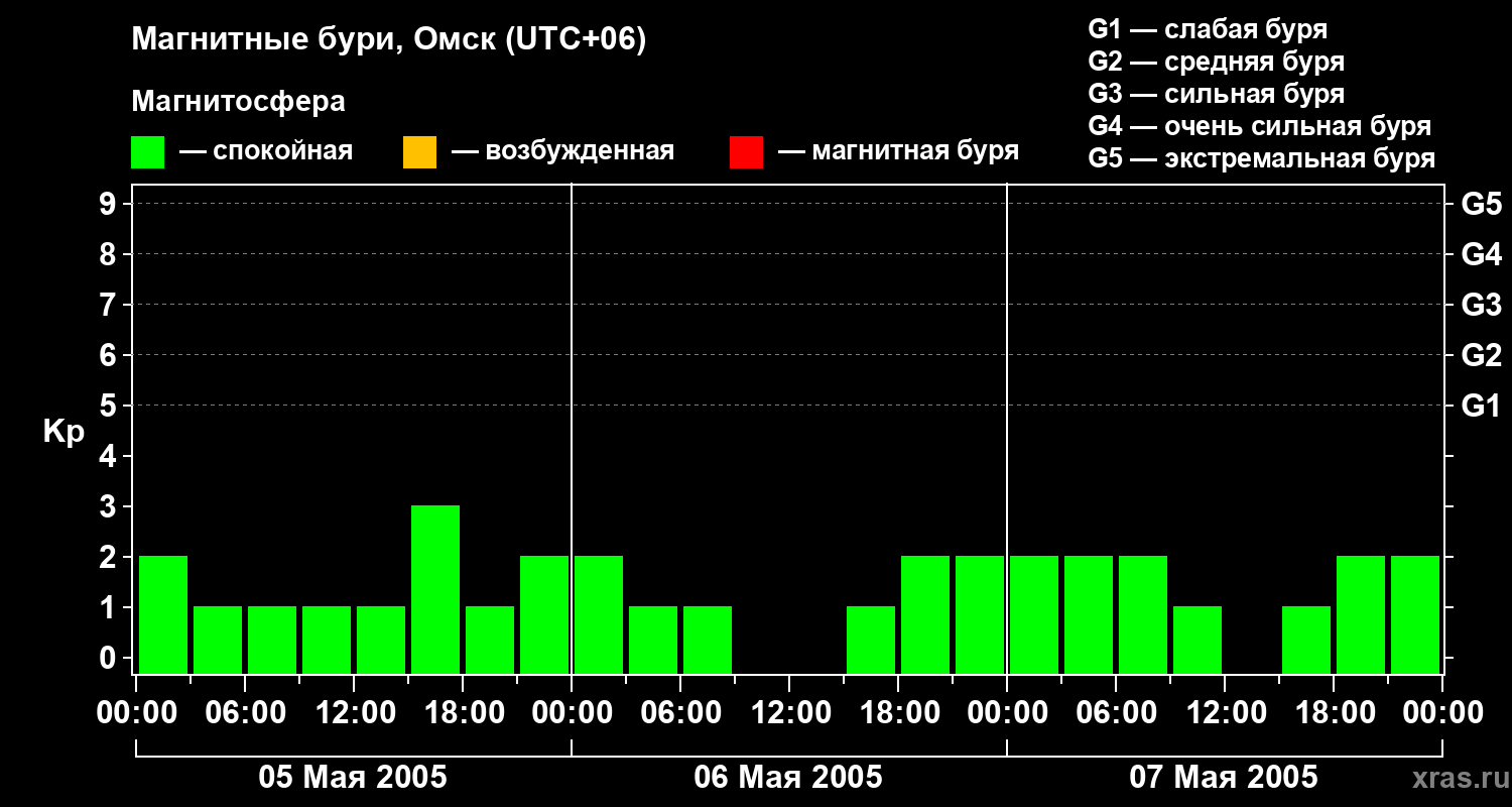Изменения геомагнитного индекса Kp с 5 по 7 мая 2005 года для средних широт