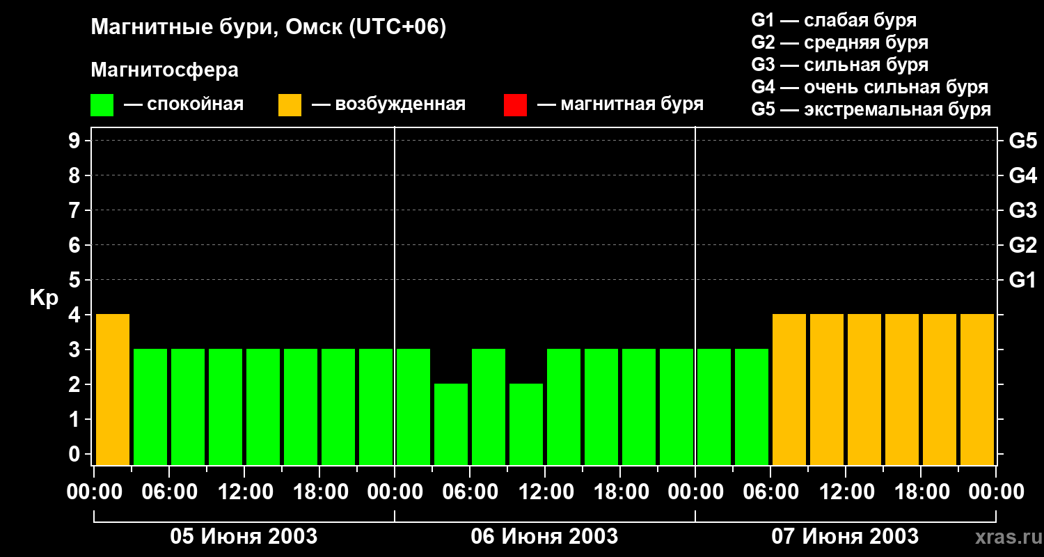 Изменения геомагнитного индекса Kp с 5 по 7 июня 2003 года для средних широт