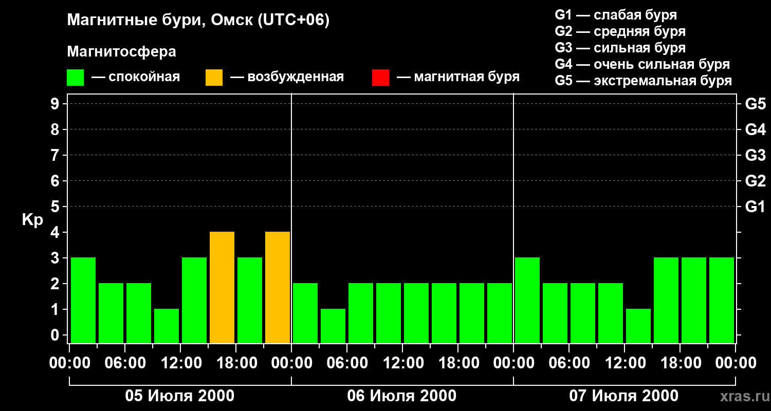 Изменения геомагнитного индекса Kp с 5 по 7 июля 2000 года для средних широт