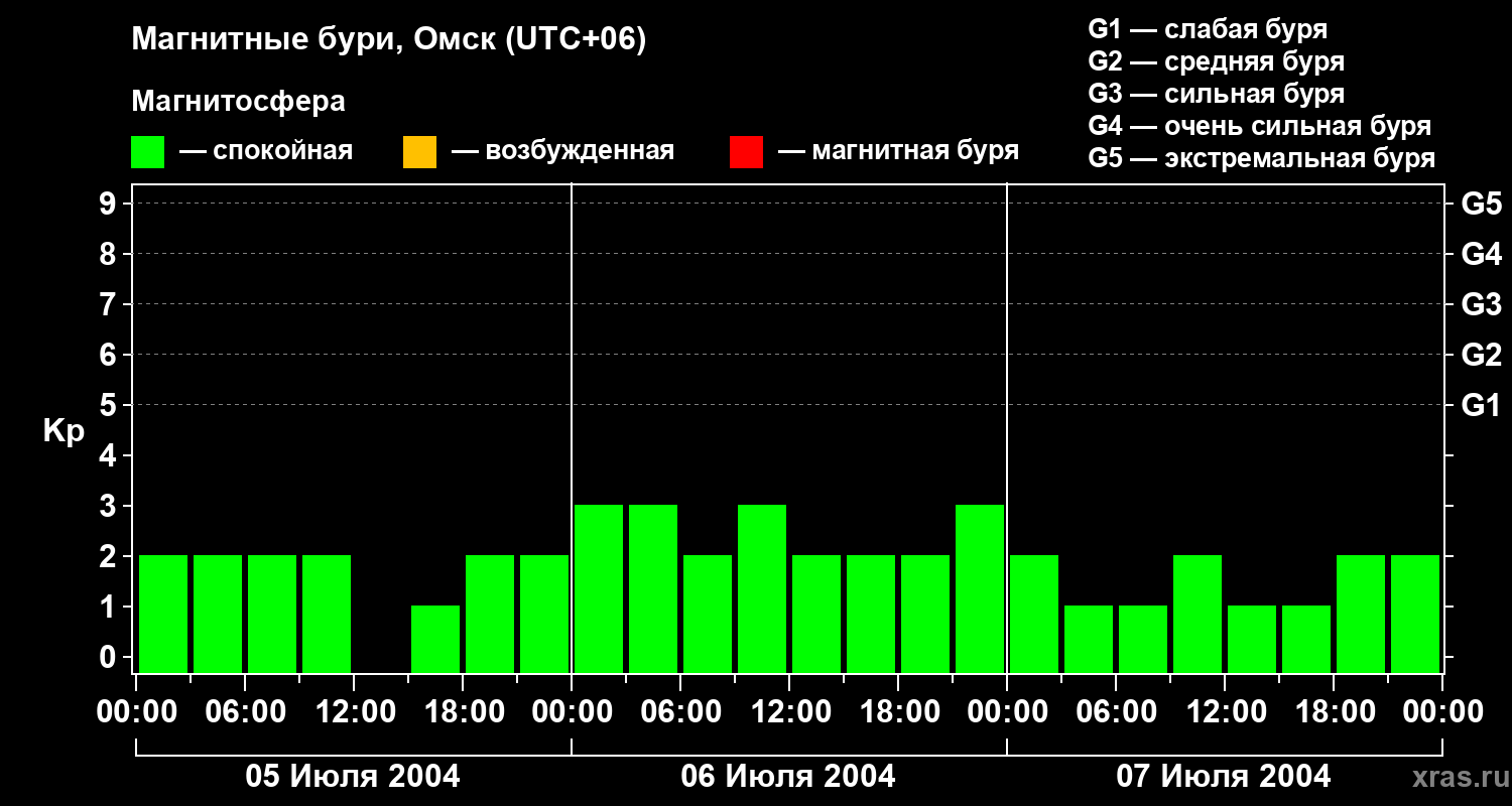 Изменения геомагнитного индекса Kp с 5 по 7 июля 2004 года для средних широт