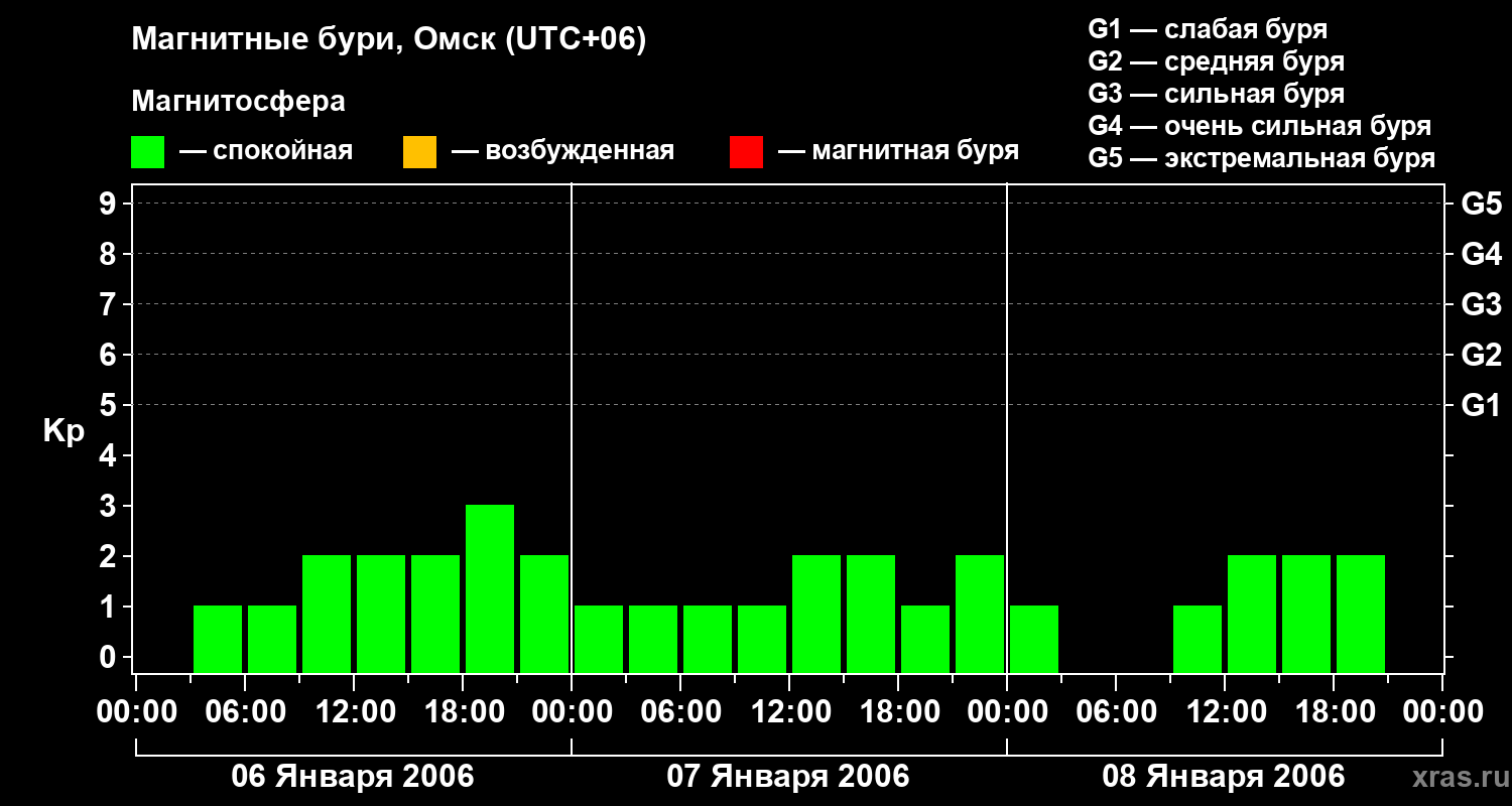 Изменения геомагнитного индекса Kp с 6 по 8 января 2006 года для средних широт