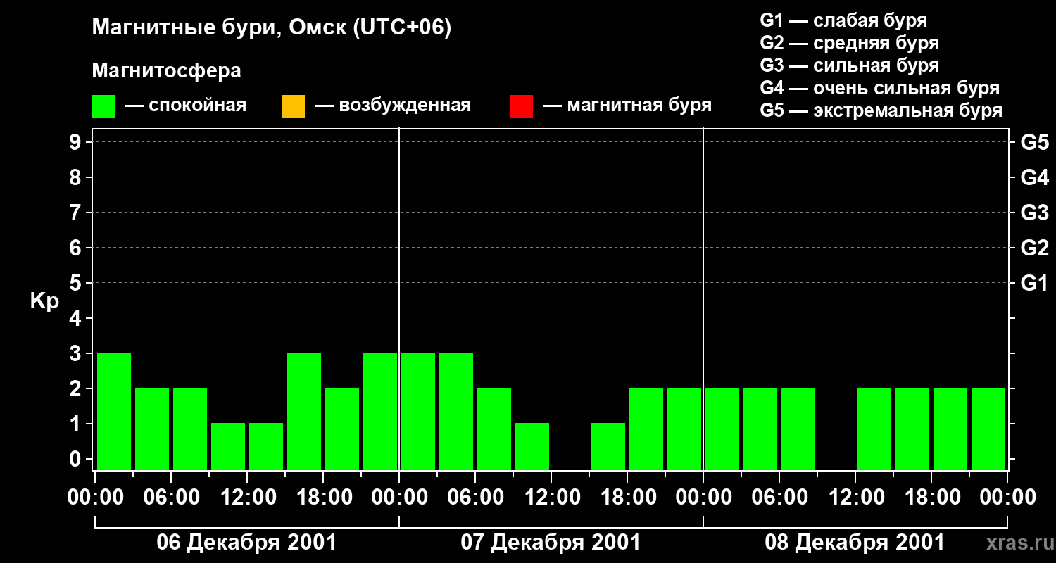Изменения геомагнитного индекса Kp с 6 по 8 декабря 2001 года для средних широт