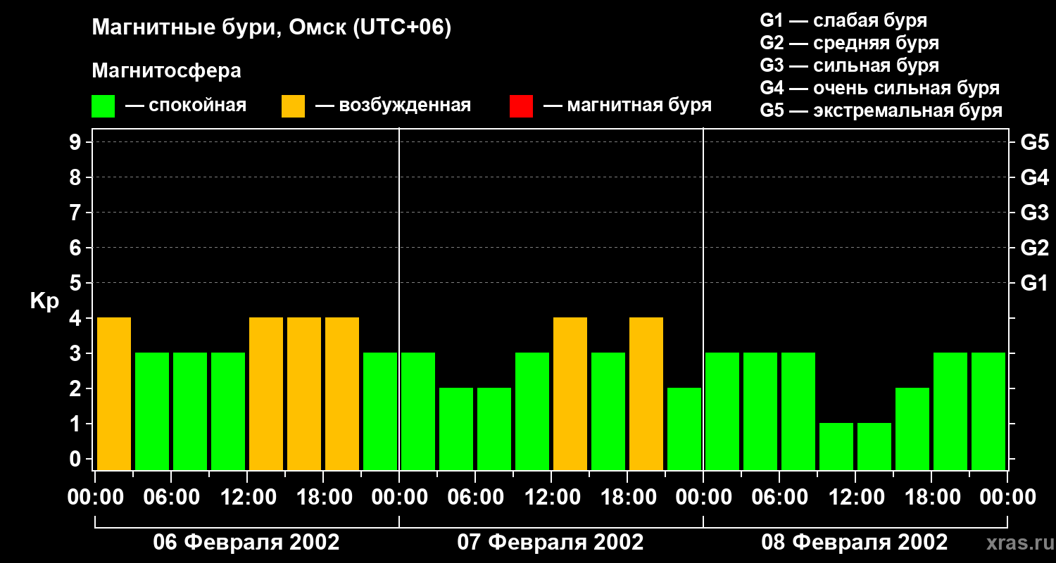 Изменения геомагнитного индекса Kp с 6 по 8 февраля 2002 года для средних широт