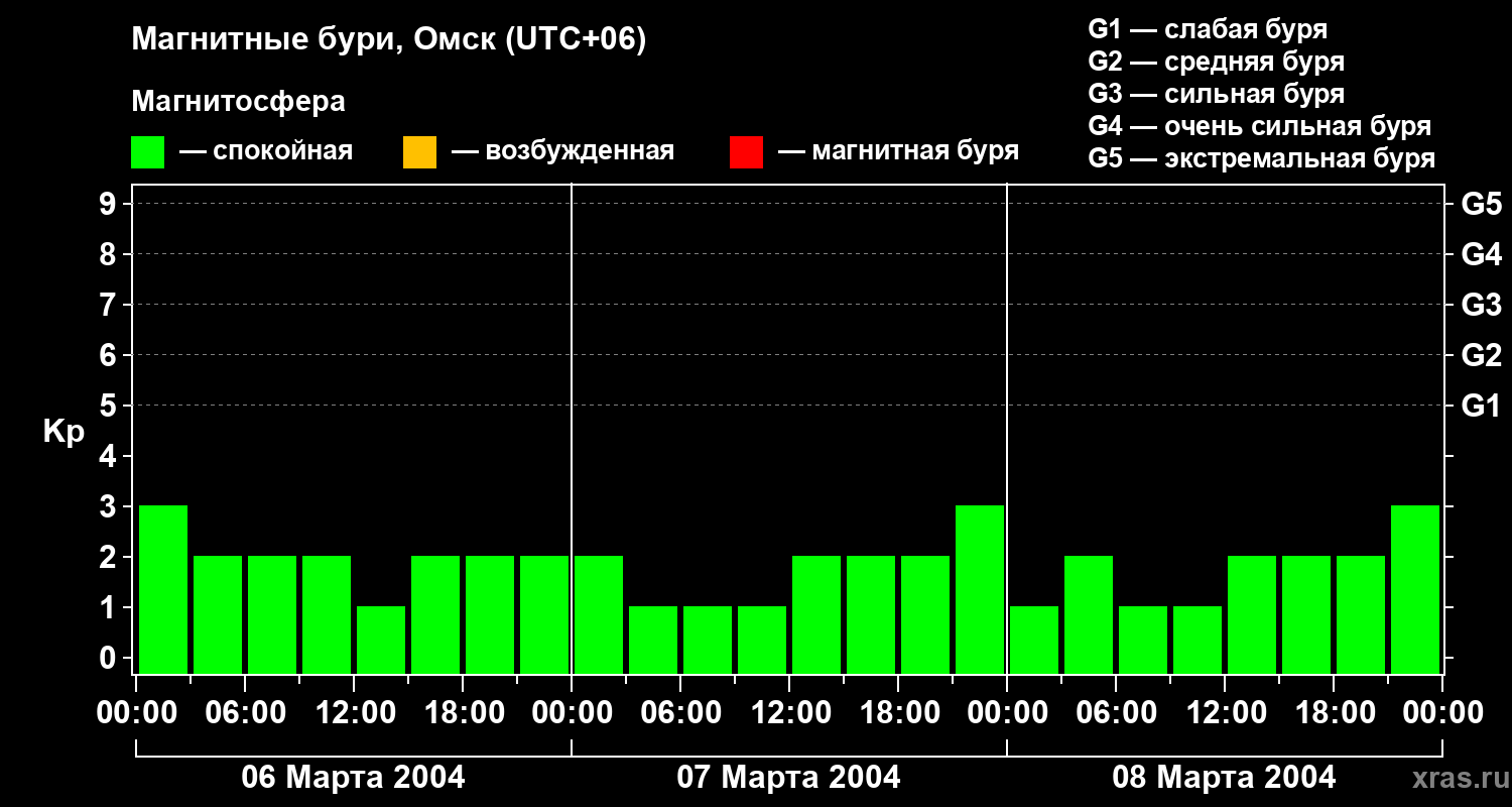 Изменения геомагнитного индекса Kp с 6 по 8 марта 2004 года для средних широт