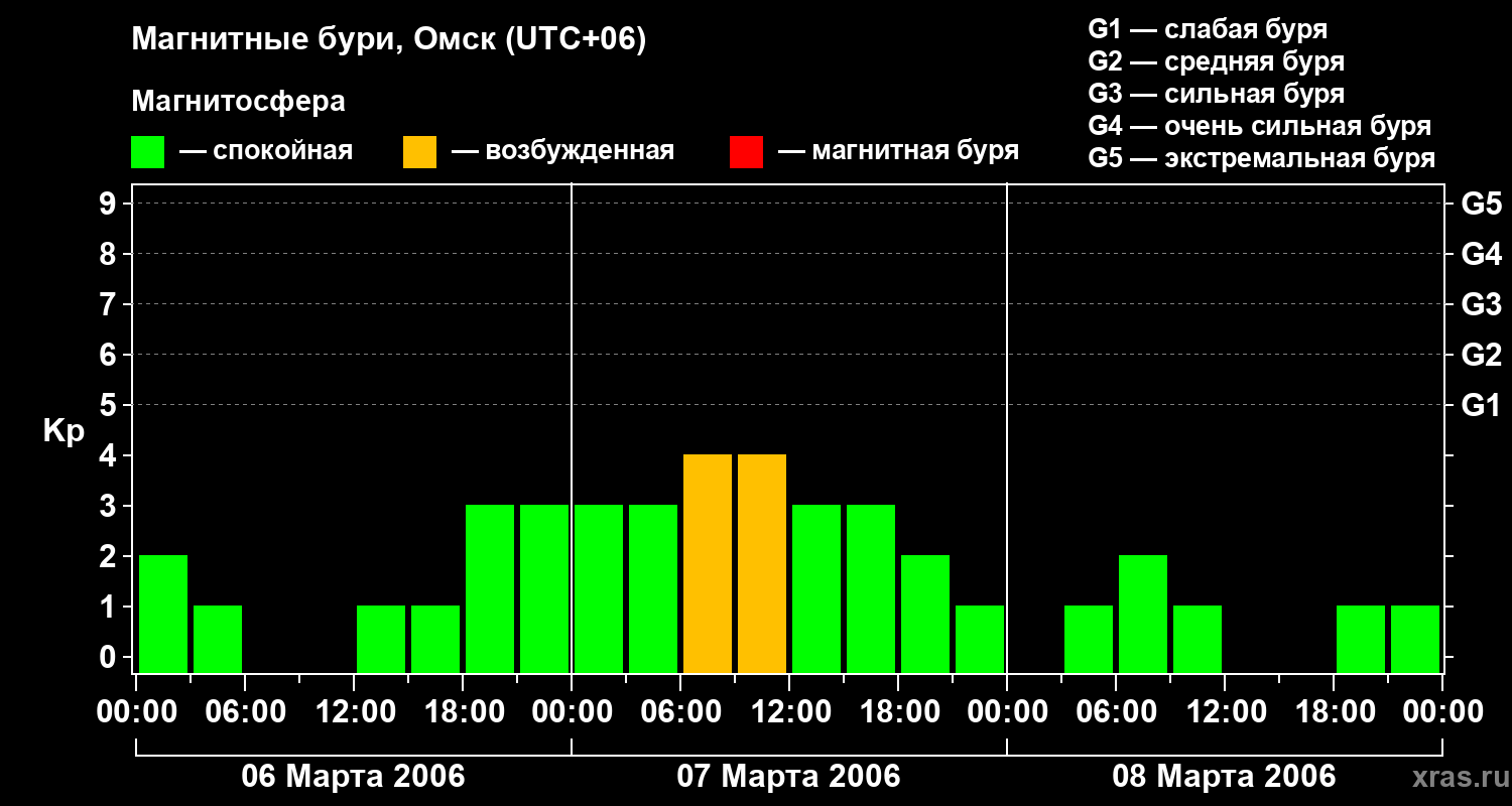 Изменения геомагнитного индекса Kp с 6 по 8 марта 2006 года для средних широт